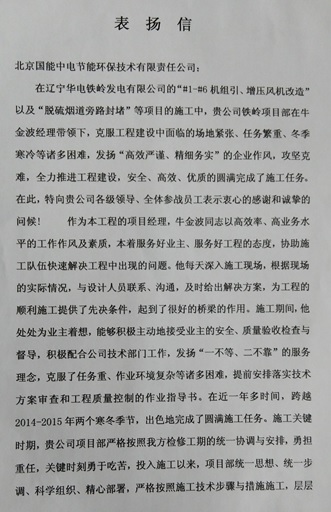 當(dāng)前位置: 國(guó)能中電公司動(dòng)態(tài)> 公司遼寧華電鐵嶺EPC項(xiàng)目受業(yè)主表?yè)P(yáng)