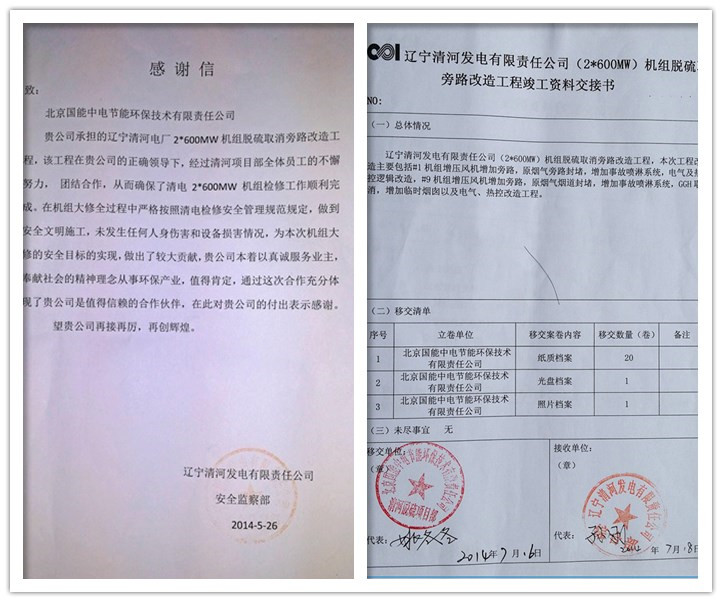 在公司總部的正確領(lǐng)導(dǎo)下,經(jīng)過(guò)清河EPC旁路改造項(xiàng)目部全體成員的共同努力,7月18日,遼寧清河發(fā)電有限責(zé)任公司業(yè)主代表在竣工資料交接證書上簽字,標(biāo)志著我公司承擔(dān)的遼寧清河電廠2*600MW機(jī)組脫硫取消旁路改造工程正式竣工驗(yàn)收,成功打響了我司在中國(guó)電力投資集團(tuán)的第一槍。