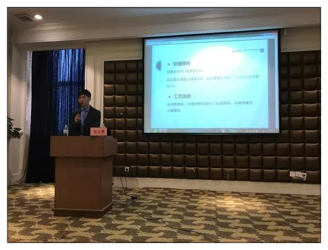 國能中電非電事業部總工程師納宏波博士在技術研討會會場就“炭基催化劑干法煙氣多污染物一體化脫除技術”與大家分享最近技術成果。