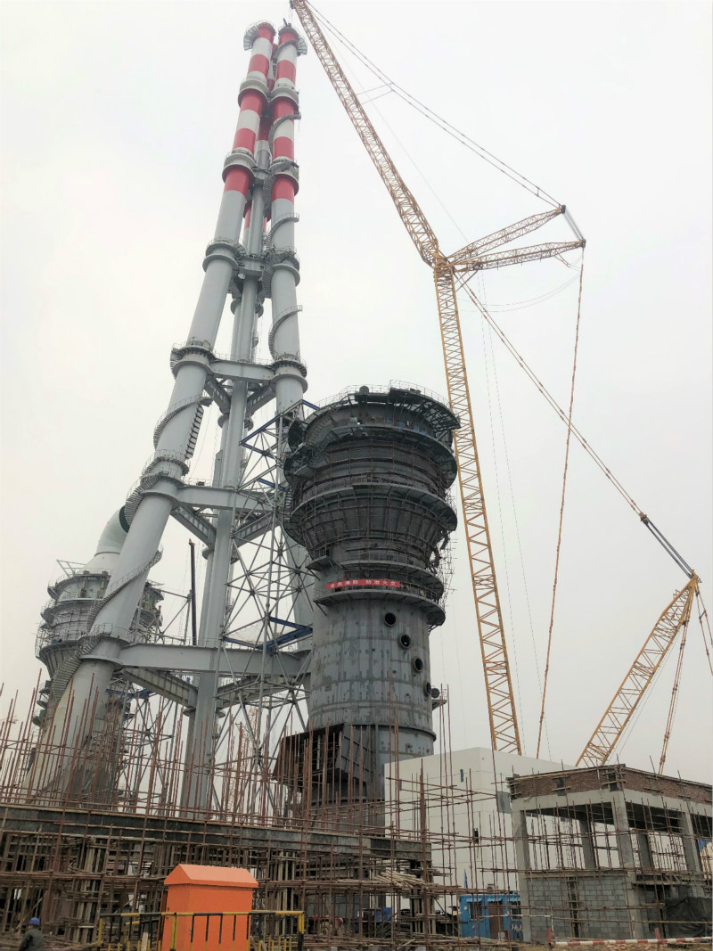 2018年12月25日上午10點10分,山鋼日照精品鋼基地2×350MW自備電廠工程三管自立式鋼煙囪第七層A、B、C筒順利吊裝就位,煙囪主體鋼結(jié)構(gòu)吊裝到頂。這標(biāo)志著我國第一根180米三管自立式鋼煙囪,也是首根采用內(nèi)壁鈦板貼襯防腐的大型鋼管結(jié)構(gòu)煙囪的落成。