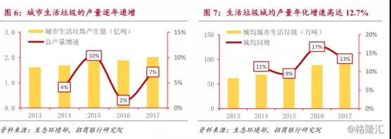 生活垃圾方面,2017年全國2017 年全年我國202個大、中城市生活垃圾產(chǎn)生量為2.02億噸,同比增長7.1%;城市平均產(chǎn)量約為100萬噸,同比增長13%,近5年來城市平均生活垃圾產(chǎn)量的增速已高達12.7%,相關市場人士預計2018至2020年我國城鎮(zhèn)生活垃圾產(chǎn)量分別可達到4.1億噸、4.6億噸、5.2億噸,倘若將鄉(xiāng)村生活垃圾合并考慮,2018年至2020年我國生活垃圾總產(chǎn)量分別達到4.8億噸、5.4億噸、6.1億噸。